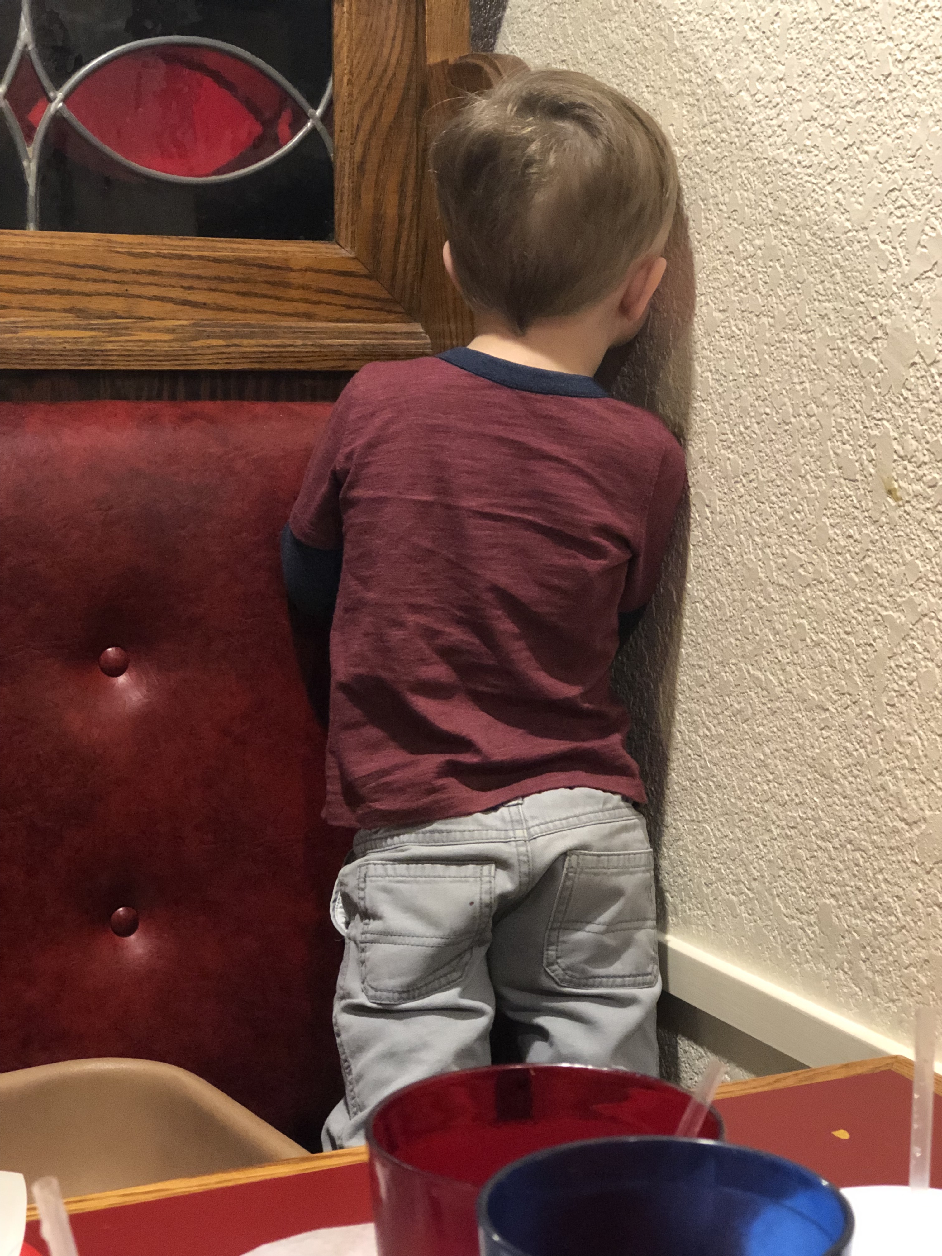 Stay consistent with discipline, even while on vacation, or things are going to get crazy! Here is Jackson with his nose in the corner of the dinner booth. He has a bad habit of not swallowing his food so sometimes he has to stand in the corner until he does swallow.