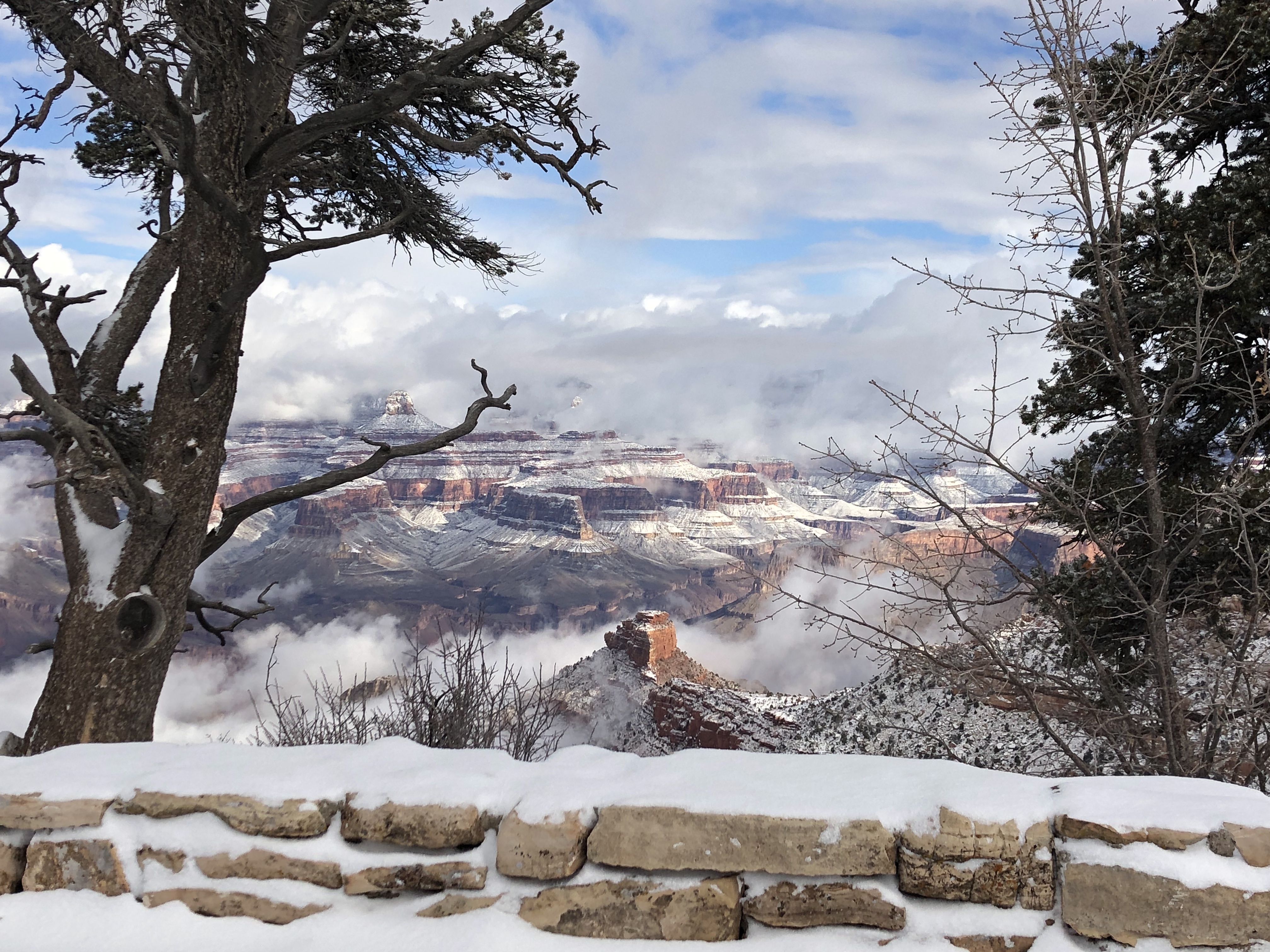 When we first passed this section of the park as we were trying to exit, it was a complete white out because of the heavy snow and we could not see the canyon at all. Minutes later after we turned around and passed this section again, the snow had stopped blowing and the clouds were clearing and I got to get out of the car for a minute and enjoy this gorgeous view. It was breath taking.