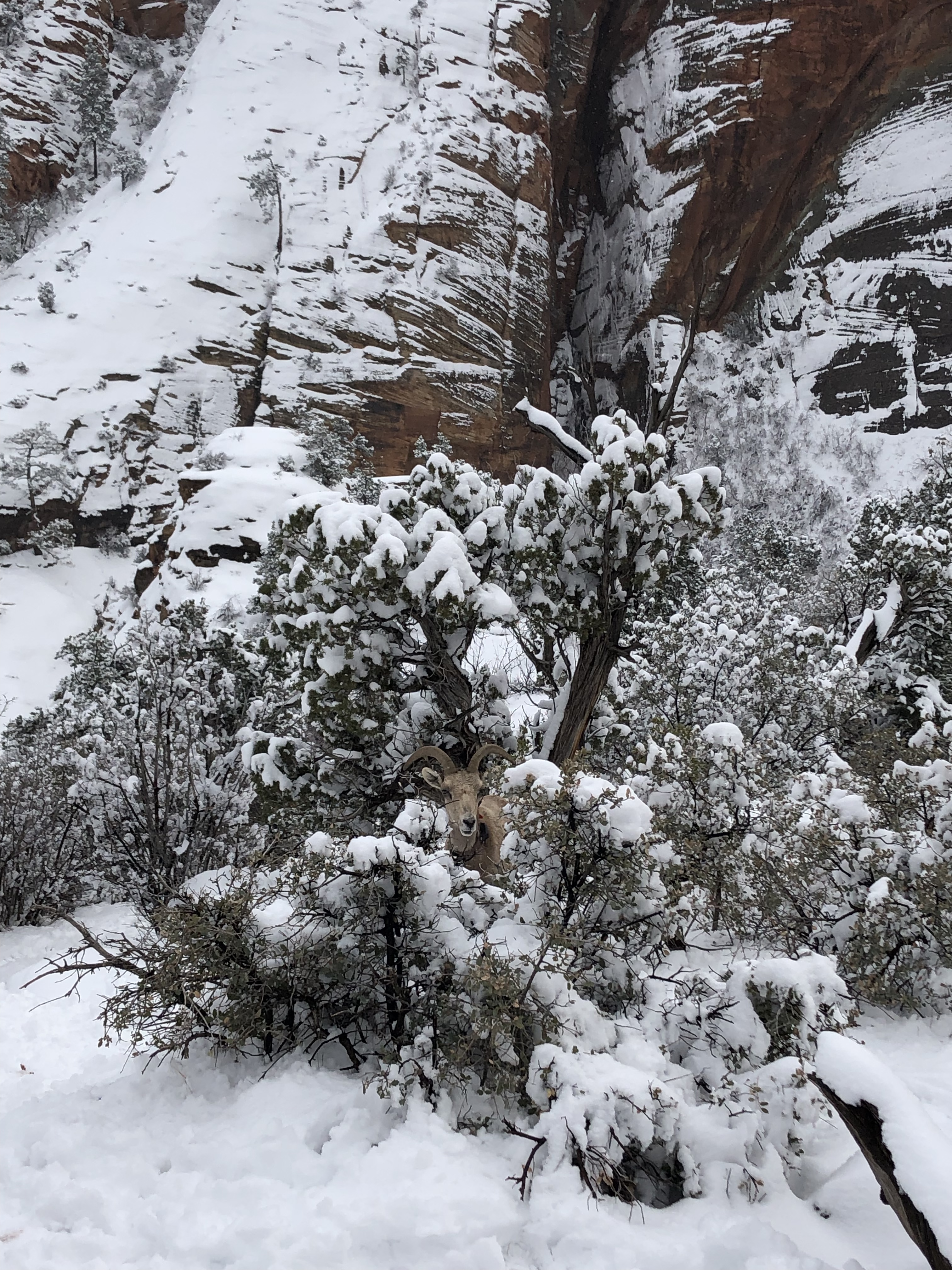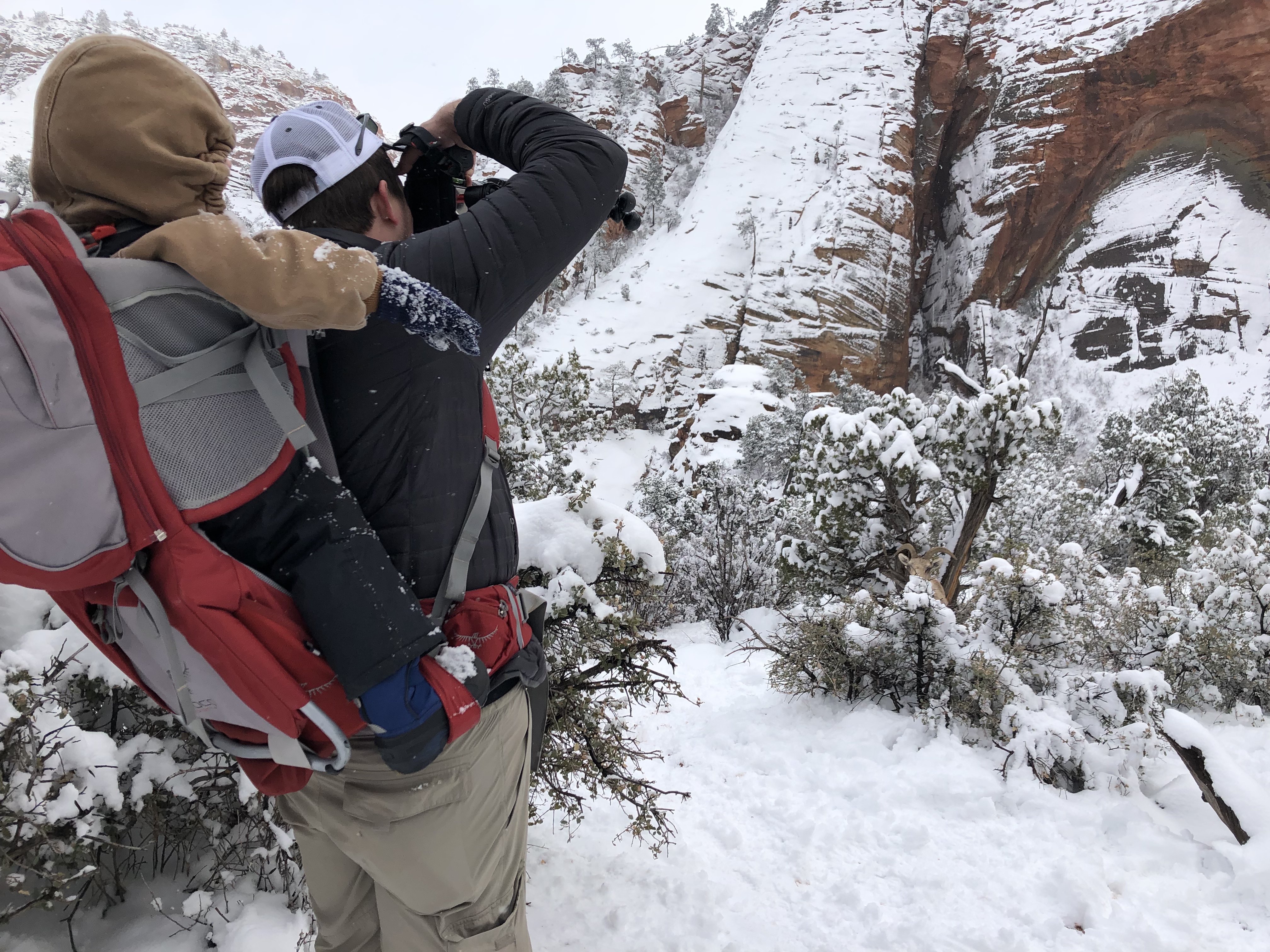 I was thrilled to have a chance to get out of the car/hotel room and into the park on foot. I realize I just said a couple of days ago that we were not getting our kids out in 20 degree weather…well, we did today. It really felt like a different 20 degrees here than it did at Grand Canyon, though. There was no wind today so that made a huge difference. I even got hot on the hike and stashed my jacket in the kid carrier backpack. We bundled the kids up and strapped them into the backpacks and they did great. Jackson talked the entire way there and the entire way back. He is so funny. We saw a big horn sheep near the trail and he had to announce to the other people that there was a “baa baa, there”. Emmy did just fine on the hike but didn’t say too much since she had her paci stuck in her mouth.
